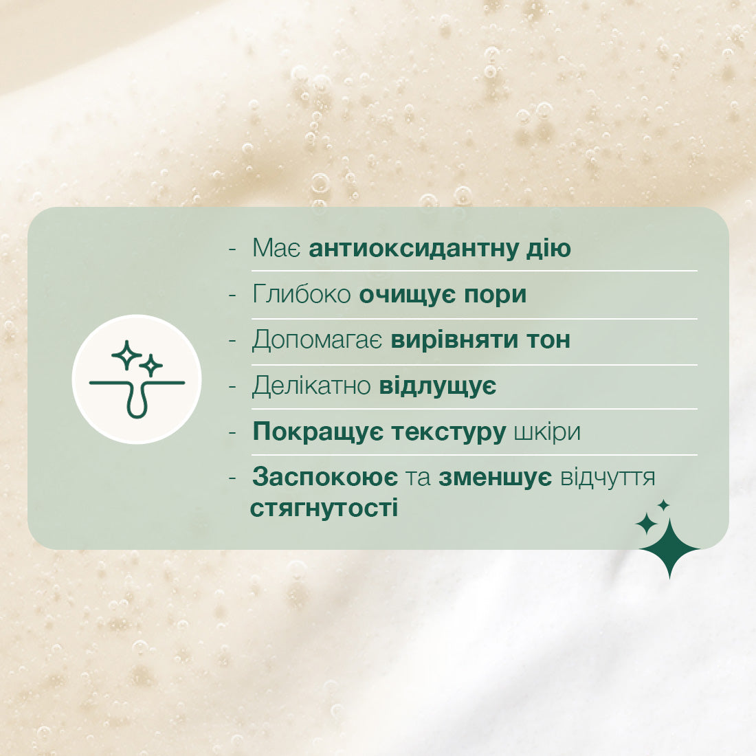 пантенол, алантоїн – заспокоюють, зменшують відчуття стягнутості, підтримують комфорт навіть чутливої шкіри.